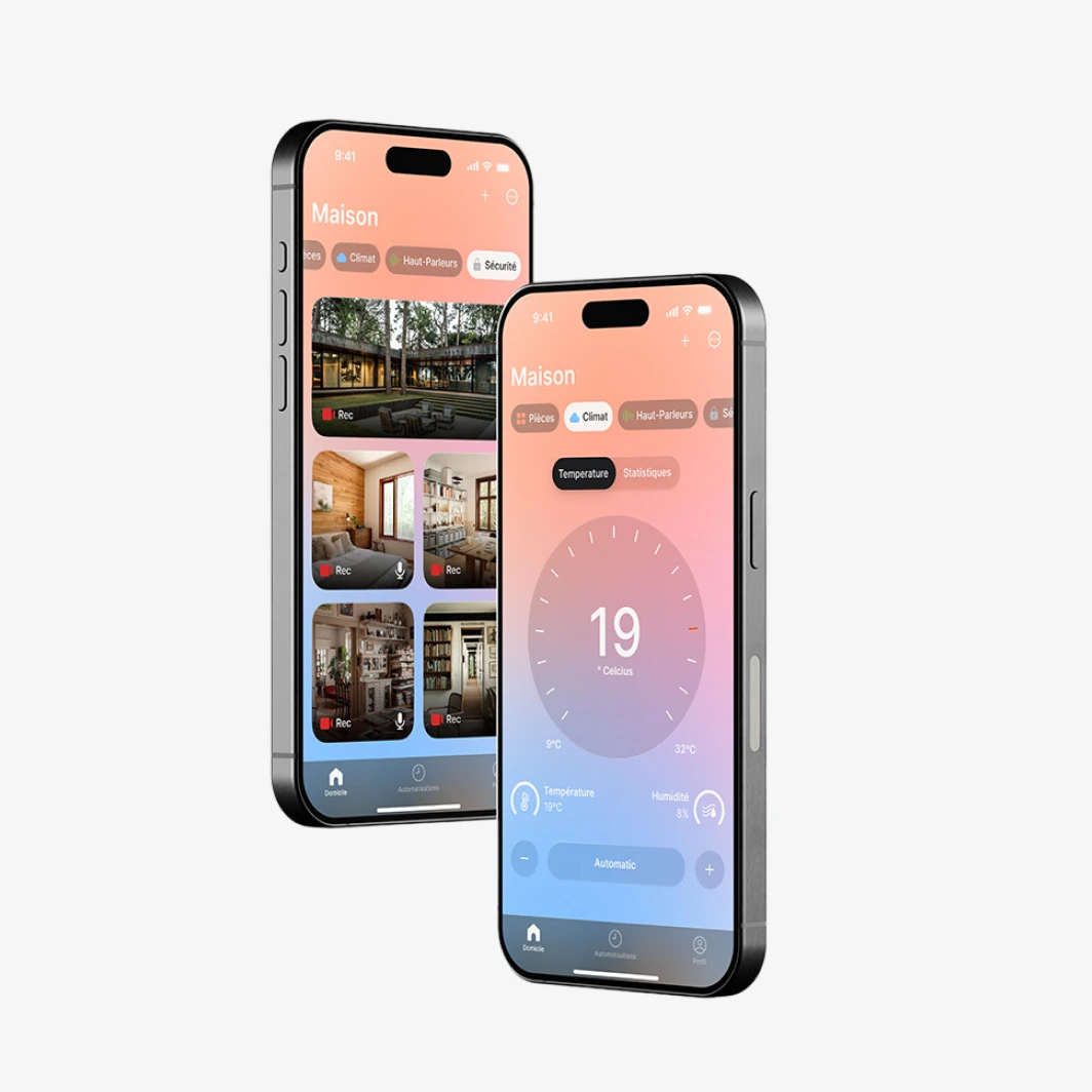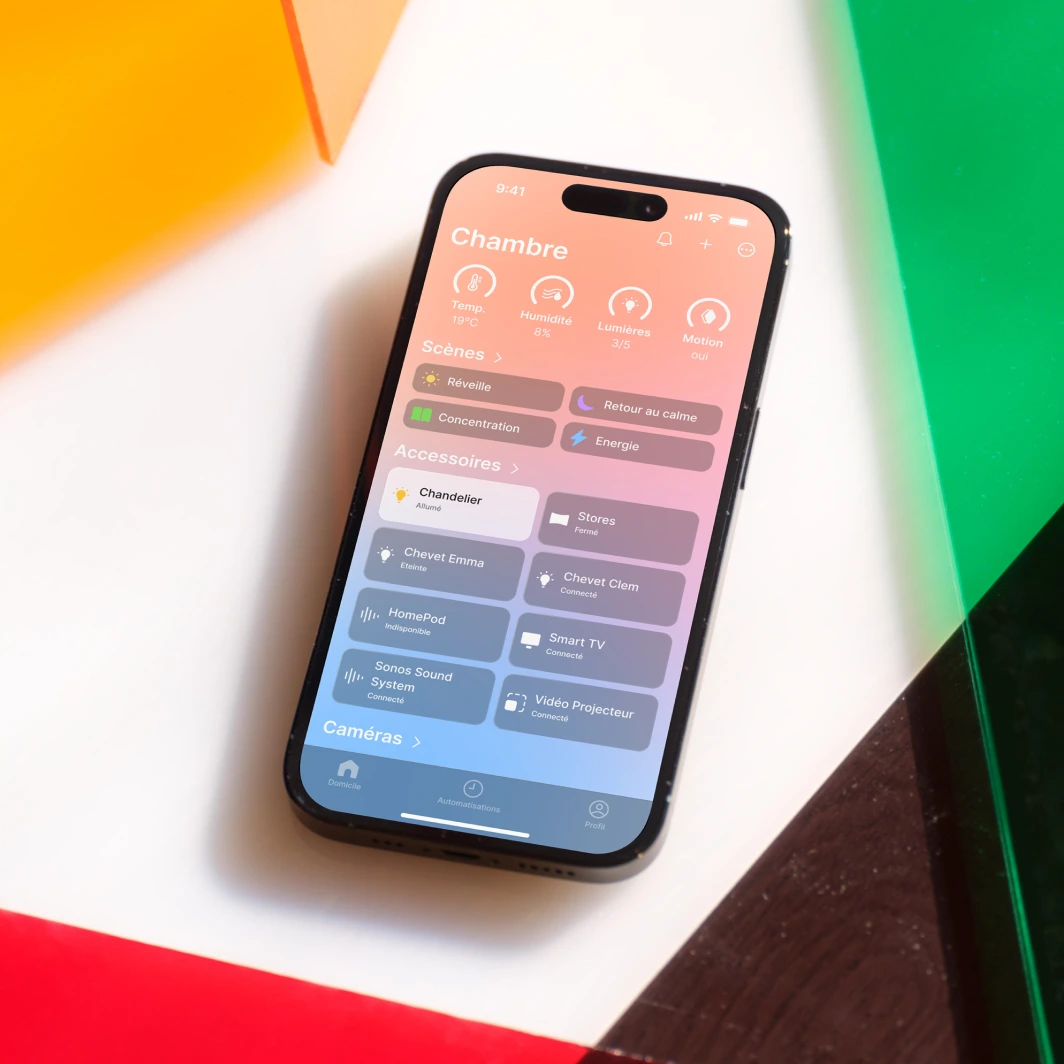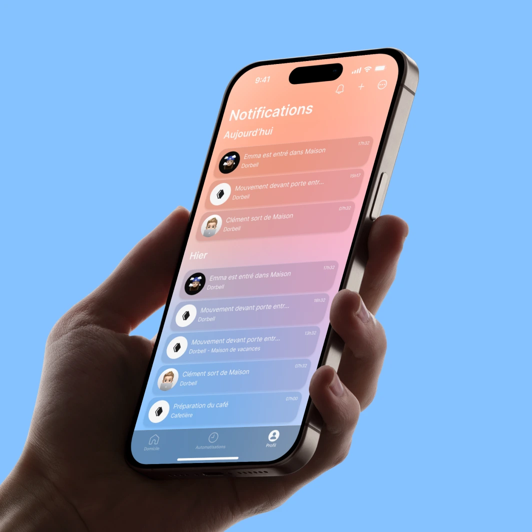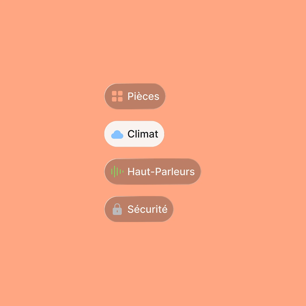 Côté interface, j’ai profité de cet exercice pour concevoir une bibliothèque de composants en glassmorphisme, un style pressenti pour se développer avec l’essor des interfaces en réalité mixte. Toutefois, la maison étant un espace de chaleur et de confort, j’ai opté pour une palette de couleurs vives et chaudes afin de renforcer cette sensation.