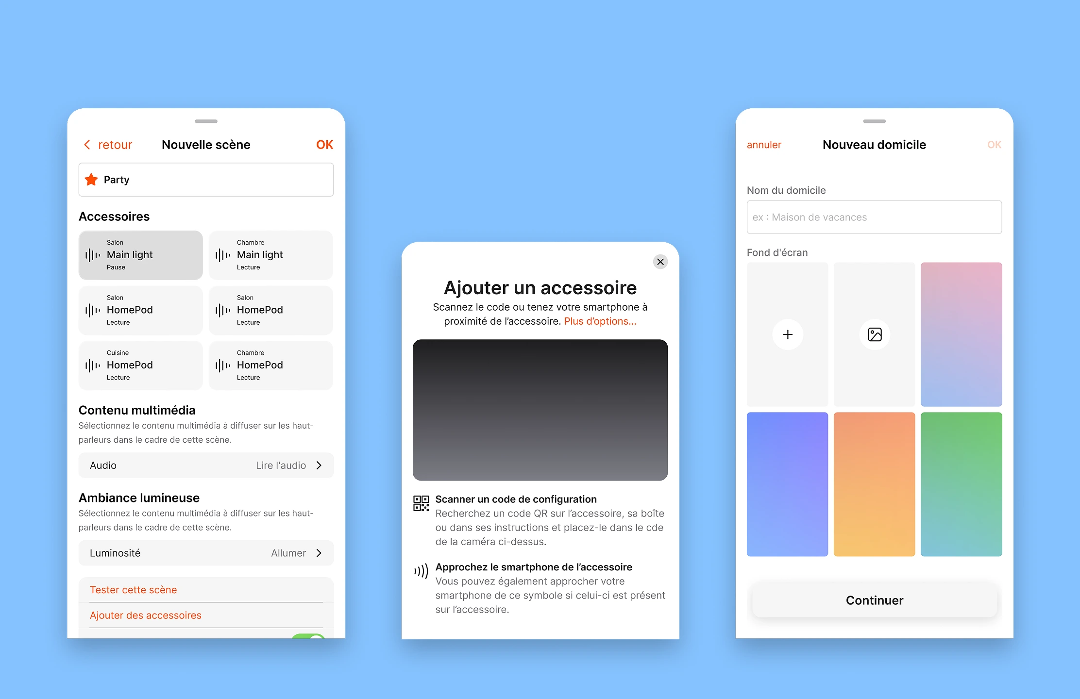 Mon objectif principal consistait à réduire au maximum le nombre d’étapes nécessaires pour réaliser une action donnée. Pour y parvenir, j’ai mené une réflexion approfondie sur les parcours utilisateurs associés à chaque type d’interaction. Ma solution a donc été de concevoir une page d’accueil centralisant les principales fonctionnalités : activation d’accessoires, vues par pièces, raccourcis par catégories, ajout d’un appareil, d’une pièce, d’un domicile, d’une scène, d’une automatisation ou d’un utilisateur — le tout de la manière la plus accessible possible.