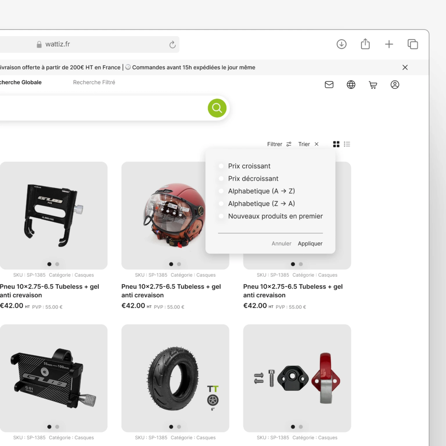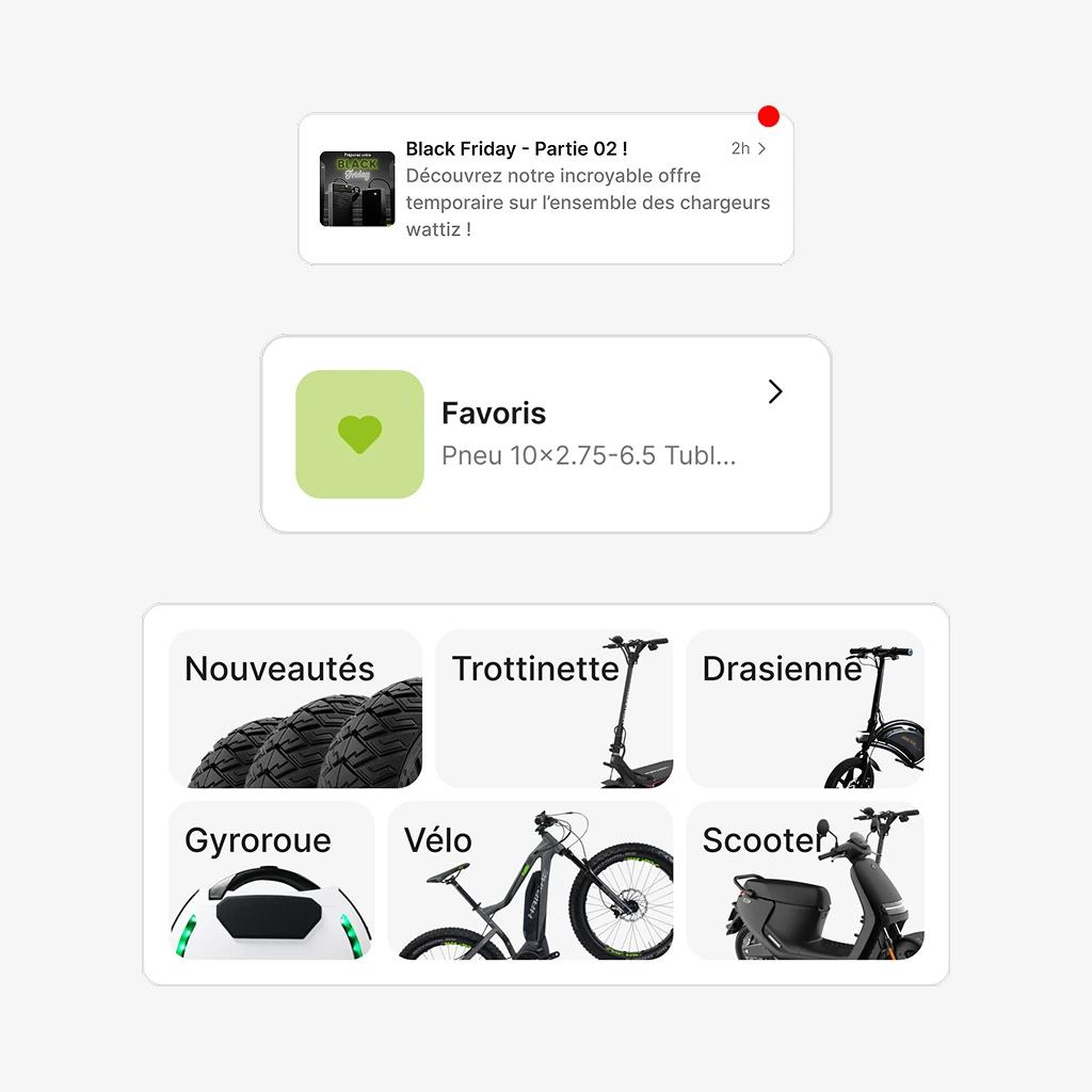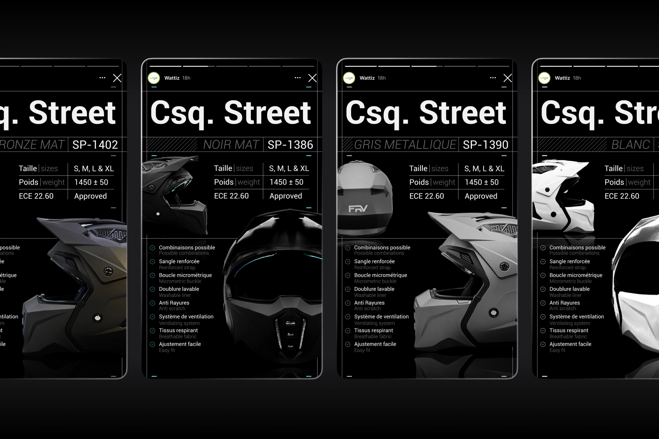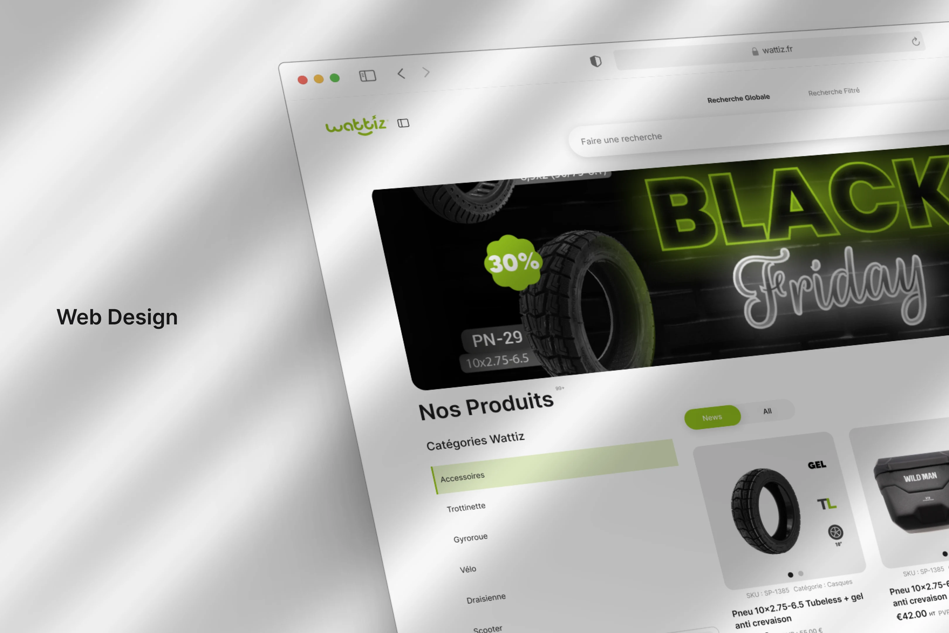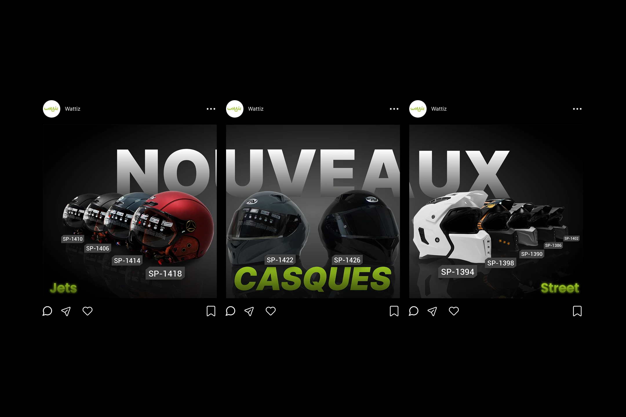 Mes solutions ont donc été la création de visuels percutants pour les réseaux sociaux adaptés aux temps forts commerciaux (restocks, offres spéciales, événements) en se basant sur une nouvelle direction photo réaliste et immersive. J’ai également conçu une nouvelle structure de mail responsive avec cette même direction artistique mais le deux projets les plus conséquent restent le design complet de l’application mobile Wattiz qui devait agir comme une solution plus ergonomique pour les commandes clients, et élaboration d’une proposition de refonte du site avec une architecture plus claire, un parcours utilisateur repensé, soigné et un design responsive plus moderne.